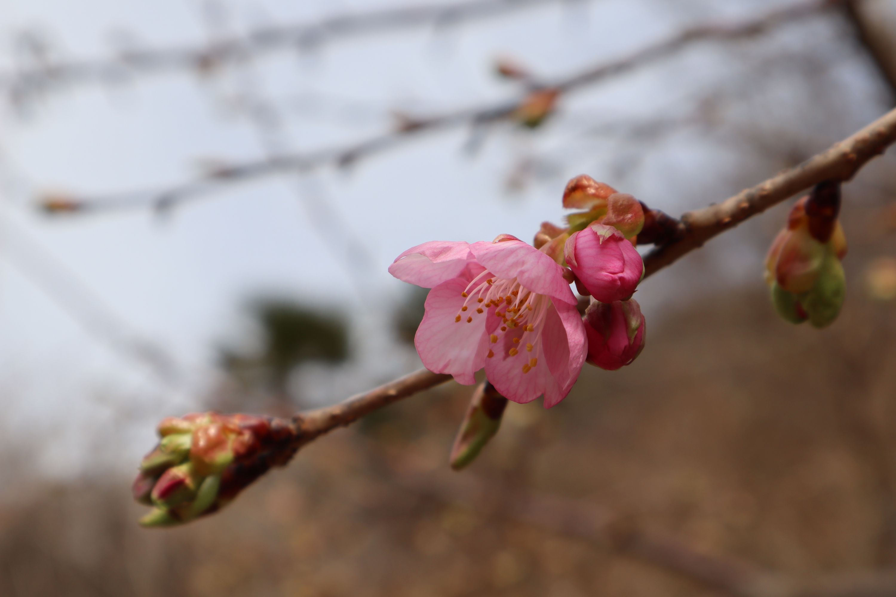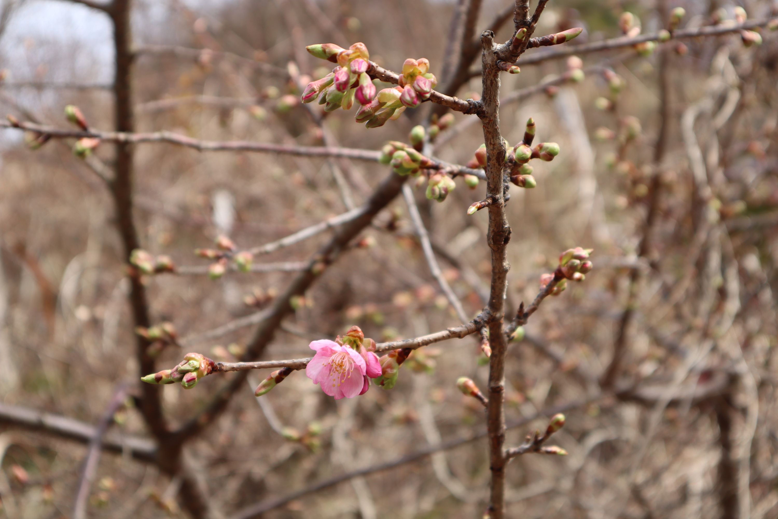 奥琵琶湖パークウェイの菅浦ゲート付近に植樹された河津桜が、いよいよ開花を迎えました。まだ1輪の確認でしたが、可憐なよそおいを見せてくれました。きれいなピンクの花びらと周辺の蕾の緑とのコントラストが美しいです。日ごとに開花が進むものと思います。ぜひご覧ください。奥琵琶湖パークウェイの開通は、3月下旬ごろの予定と伺っています。