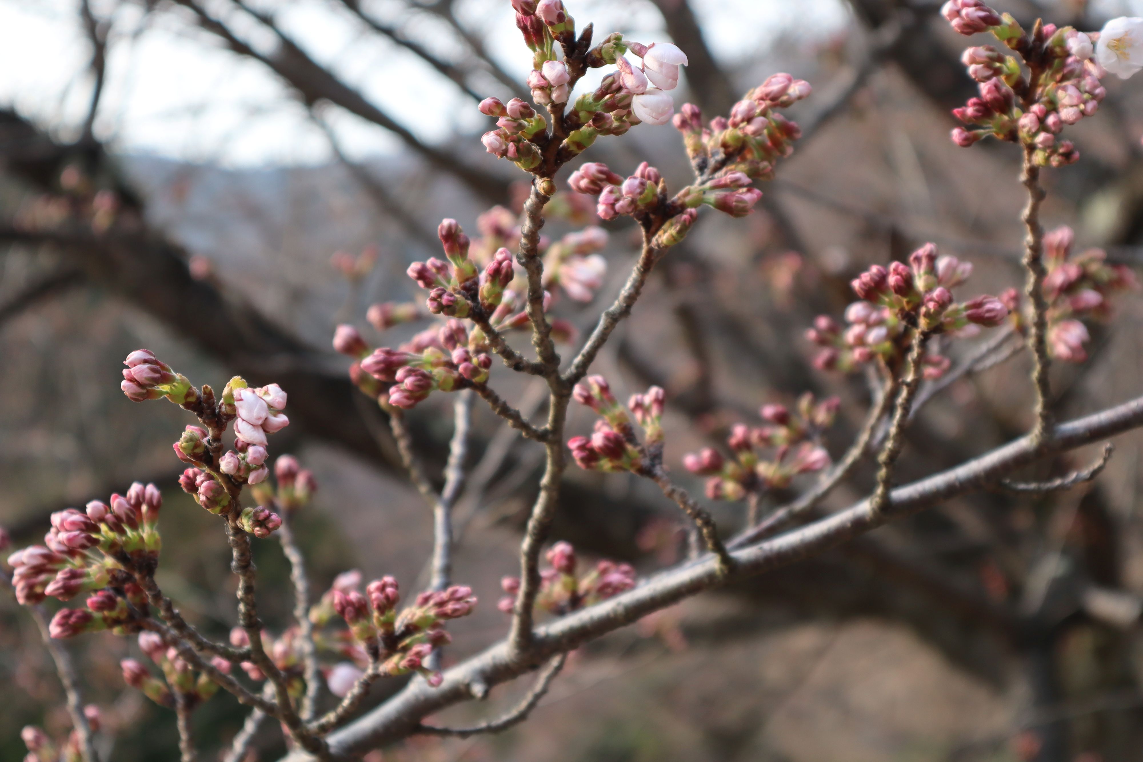 奥琵琶湖パークウェイにもようやく春が訪れました。3月29日に奥琵琶湖パークウェイの葛籠尾崎展望台のソメイヨシノ桜で、数輪ですが開花を確認しました。これからの天候次第とはなりますが、満開に向け開花が進むものと思います。4月4日(土)および翌5日(日)は、高島市の海津大崎付近は一方通行の交通規制となります。ドライブで桜のトンネルをお楽しみいただけますが、交通規制の情報にご留意願います。